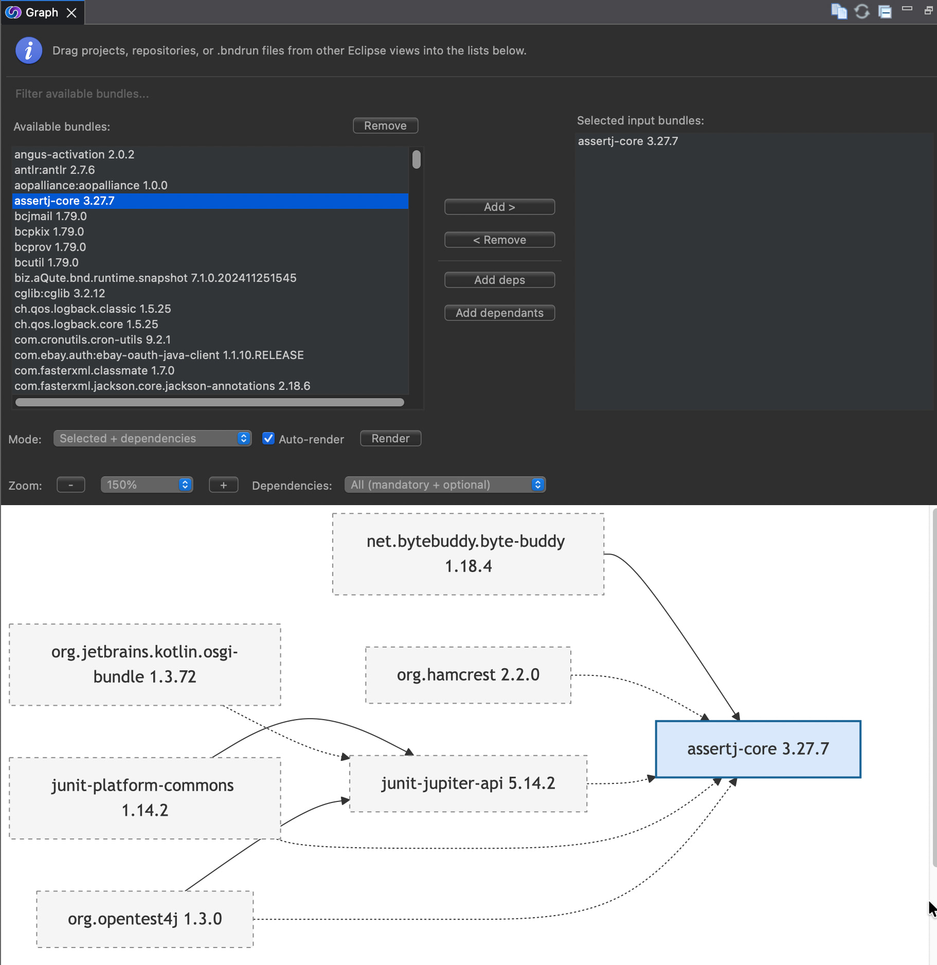 Bndtools uses the OSGi Resolver to create runtime assemblies, allowing us to concentrate on just the "top-level" bundles that comprise our application. The remaining bundles are resolved from the repositories automatically. No more wasting time trying the right combination by trying.
